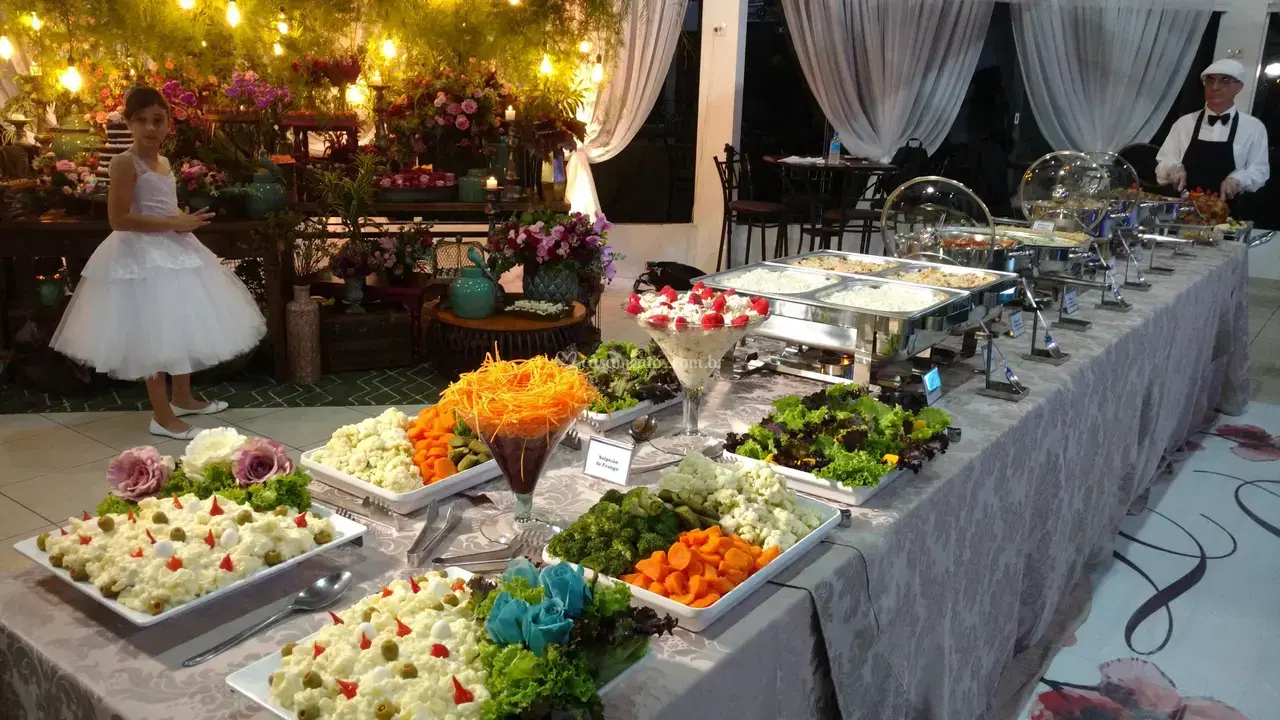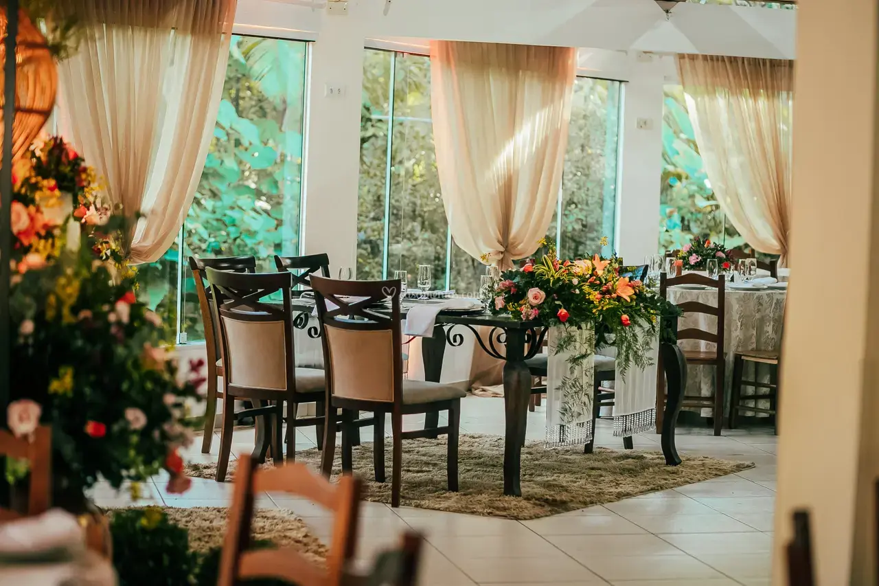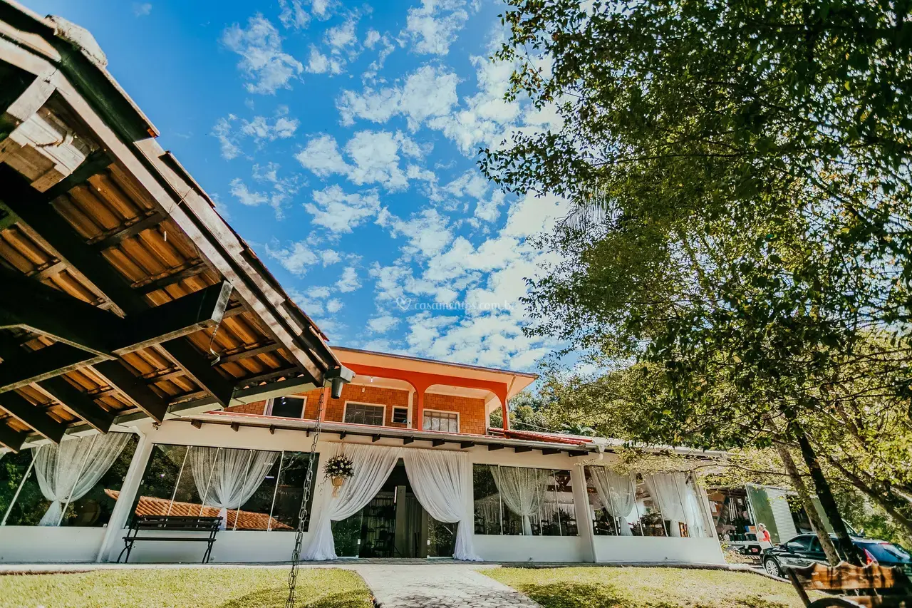 O salão de festas conta com janelões de vidro que podem ser totalmente abertos, proporcionando integração completa com a natureza e criando uma atmosfera única — ideal para quem deseja um cenário naturalmente deslumbrante sem grandes investimentos em decoração. Aqui, cada detalhe se transforma em experiência.